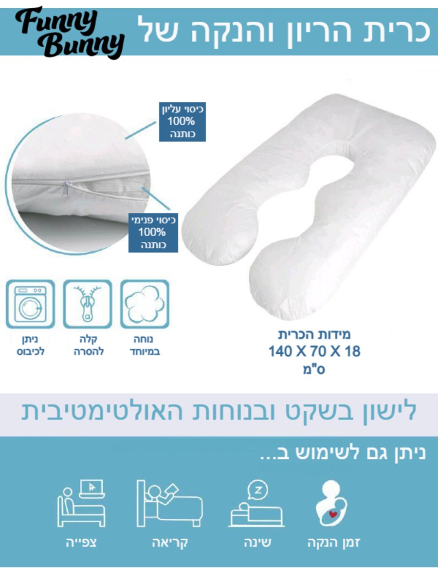 כרית תמיכה להריון והנקה עם מילוי ושכבה חיצונית 100% כותנה – לבן מבית Funny Bunny משלבת נוחות, בריאות וסטייל – כדי שתוכלי לישון ולנוח בראש שקט.