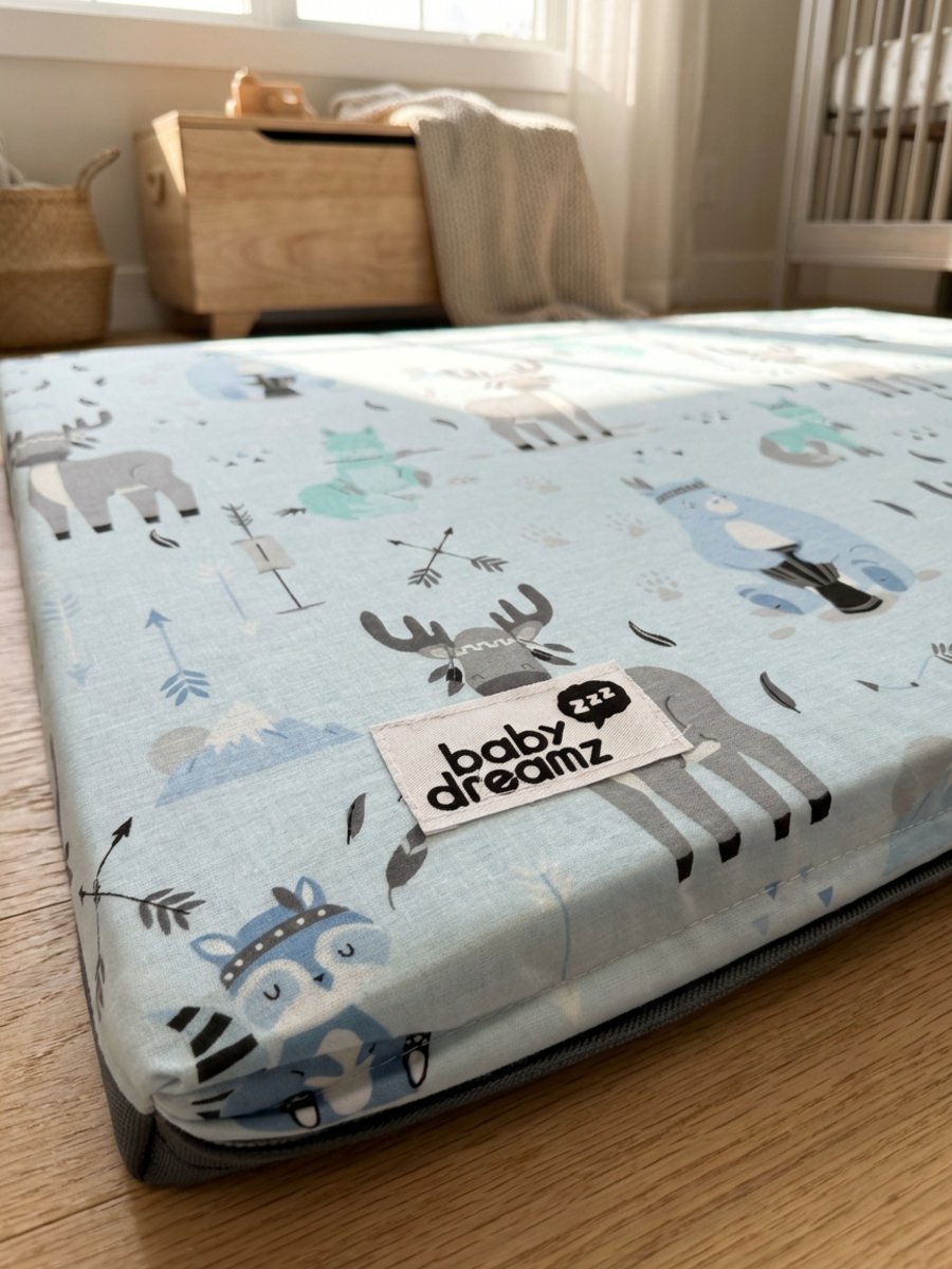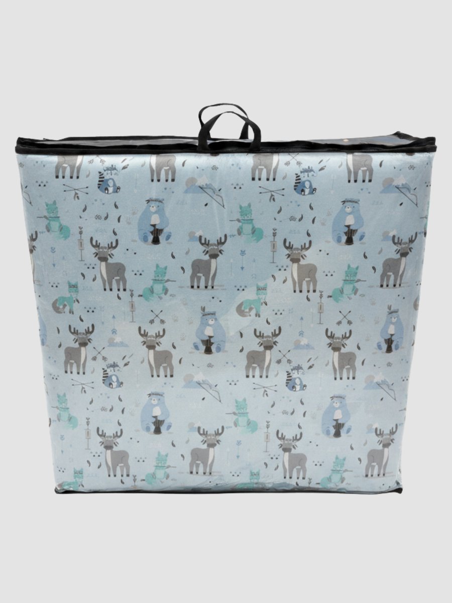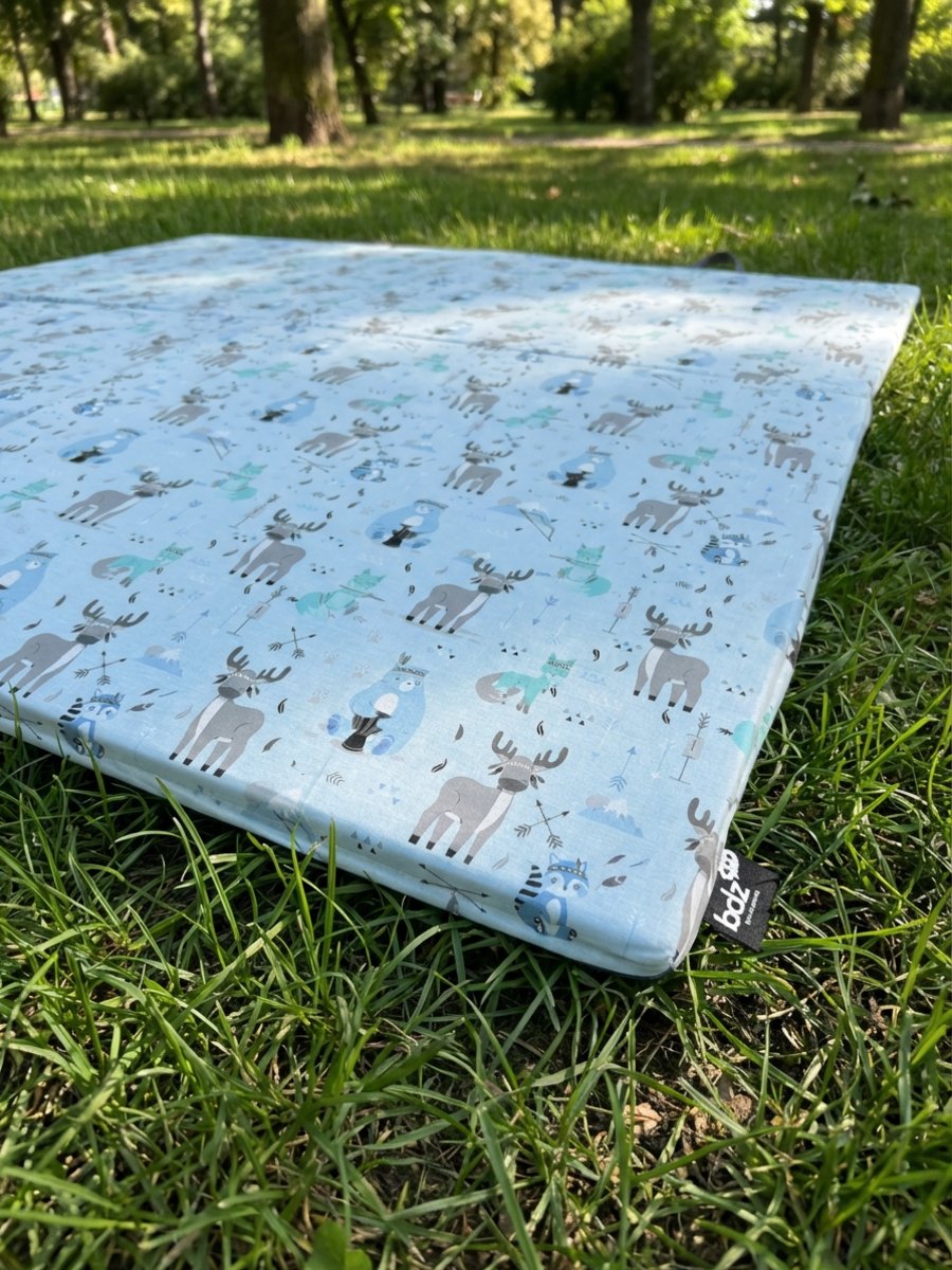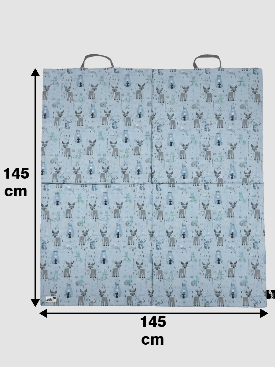 מזרן פעילות מתקפל 100% כותנה אורגנית איילים תכלת משלב גודל מרווח, ריפוד נעים ועיצוב נקי – לשגרת משחק יומיומית נוחה בבית, בפארק או ביער.